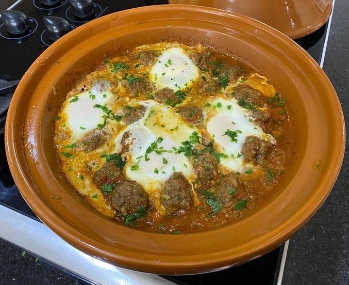 Découvrez l’art culinaire marocain avec notre kefta, délicatement cuite dans une succulente sauce tomate accompagné d’oeuf, richement parfumée aux épices authentiques du Maroc.